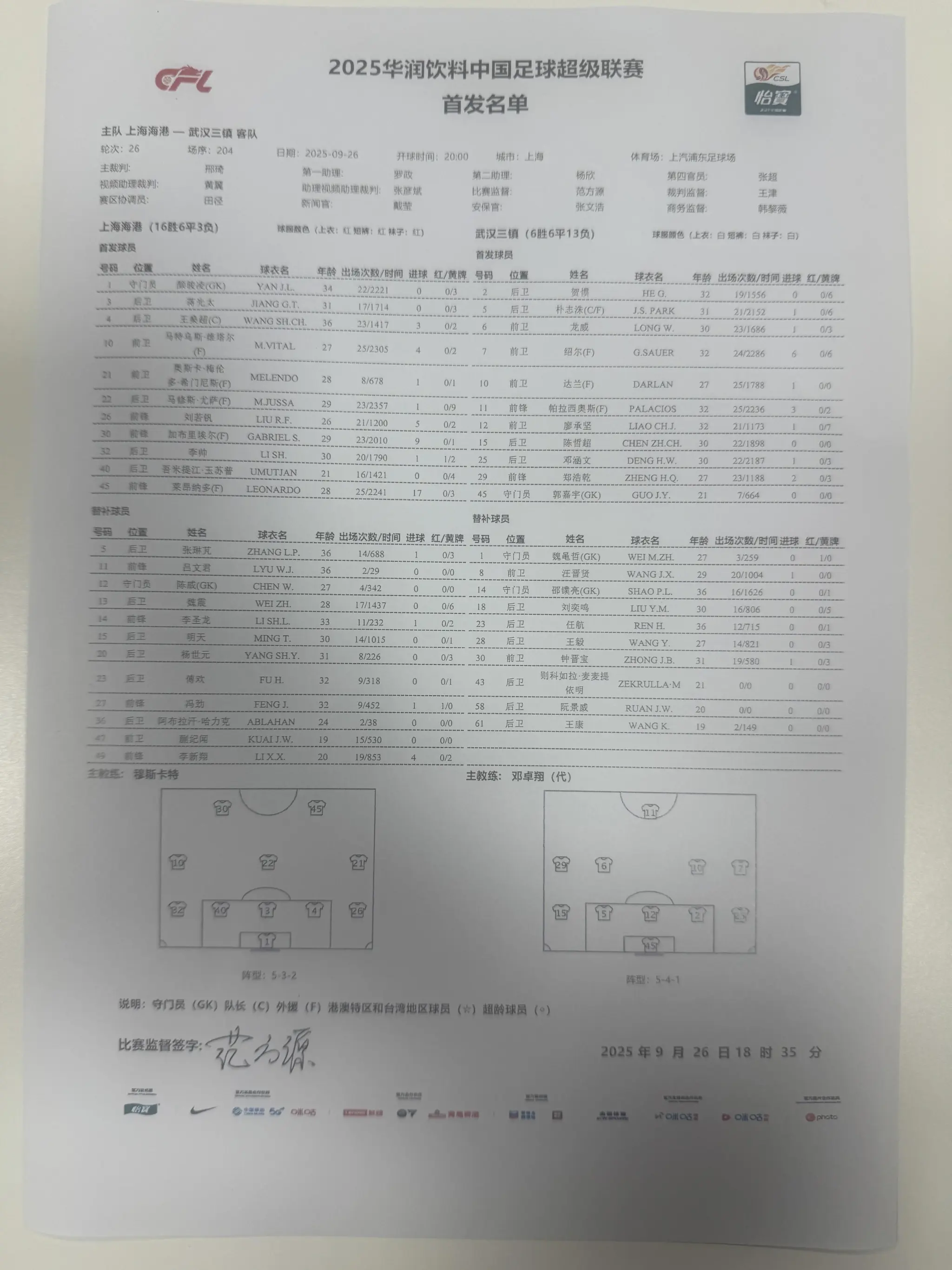 虎扑09月26日讯 北京时间今天20:00,上海海港主场迎战武汉三镇,赛前双方公布首发名单。